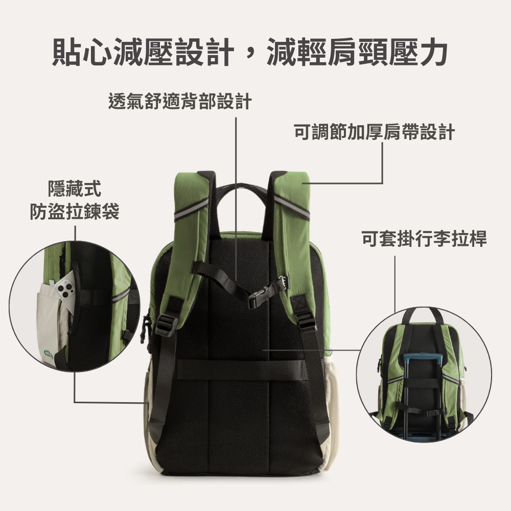 貼心減壓設計,透氣背部與加厚可調肩帶,長時間背負也舒適。隱藏式防盜拉鍊袋守護重要物品,還能套掛行李拉桿,通勤或旅行都輕鬆搞定。