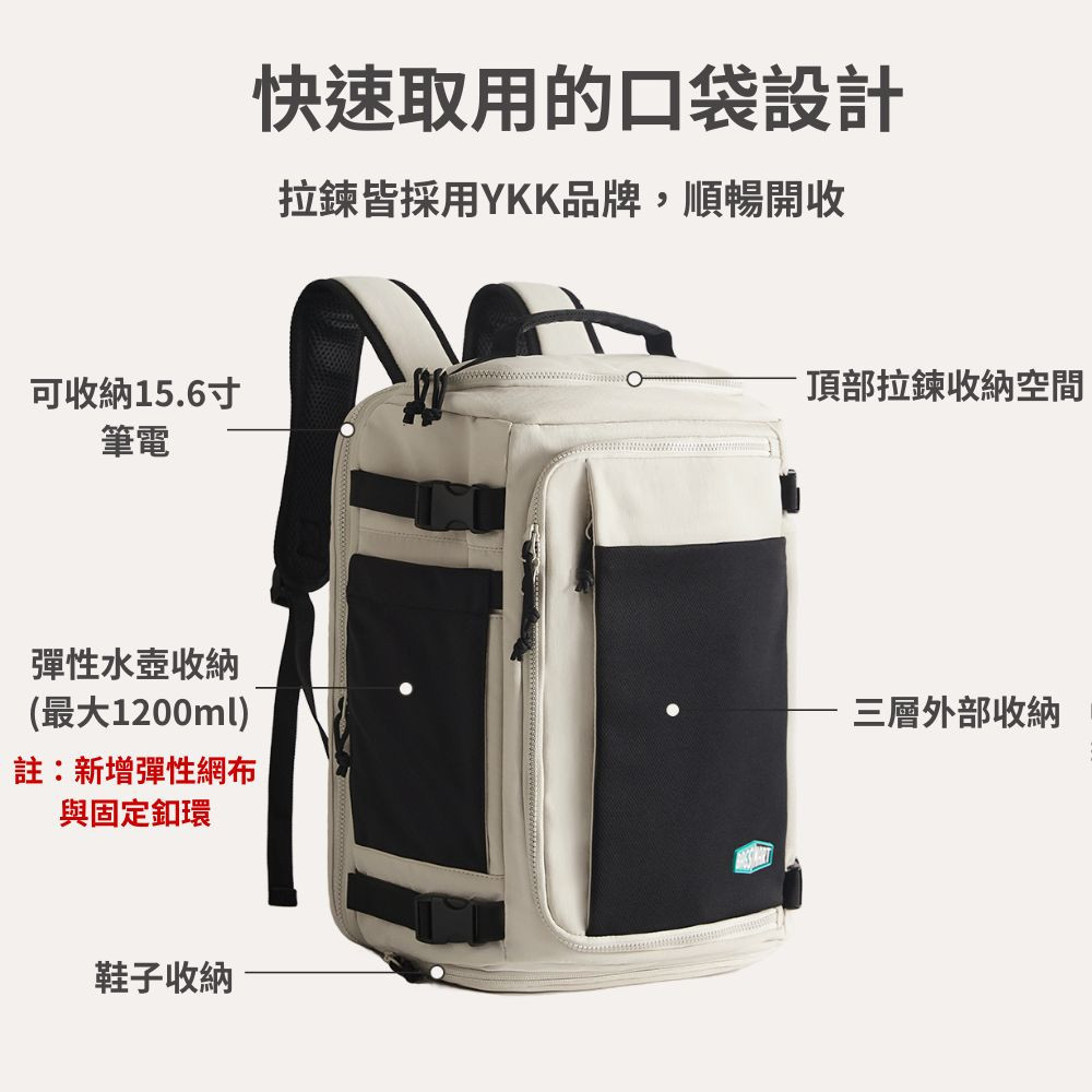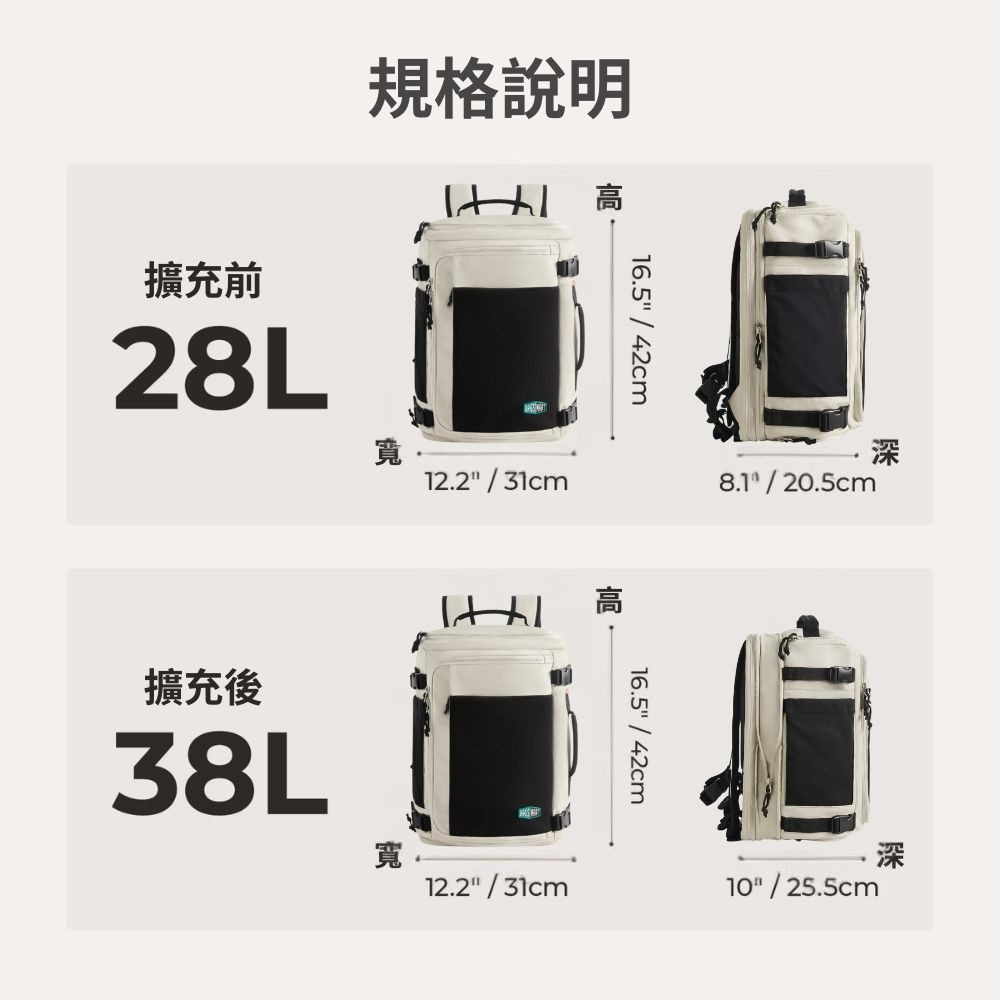 大容38L可擴充空間,適用長途旅行、短途旅遊、工作出差、露營登山情境