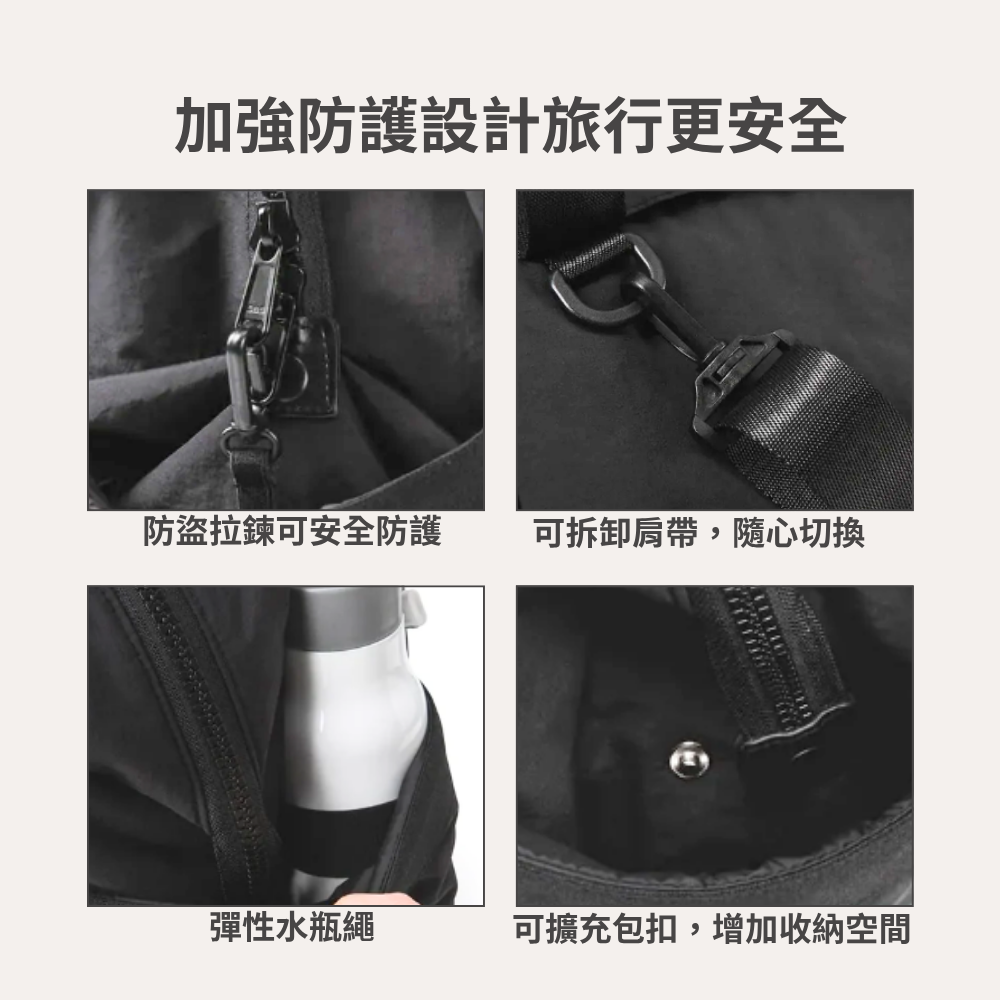 大容量收納,寬敞主隔層可放衣物與必需品,側邊彈性口袋輕鬆收納水瓶或雨傘。一包多用,隨走隨行,讓每一次出發都更自在!