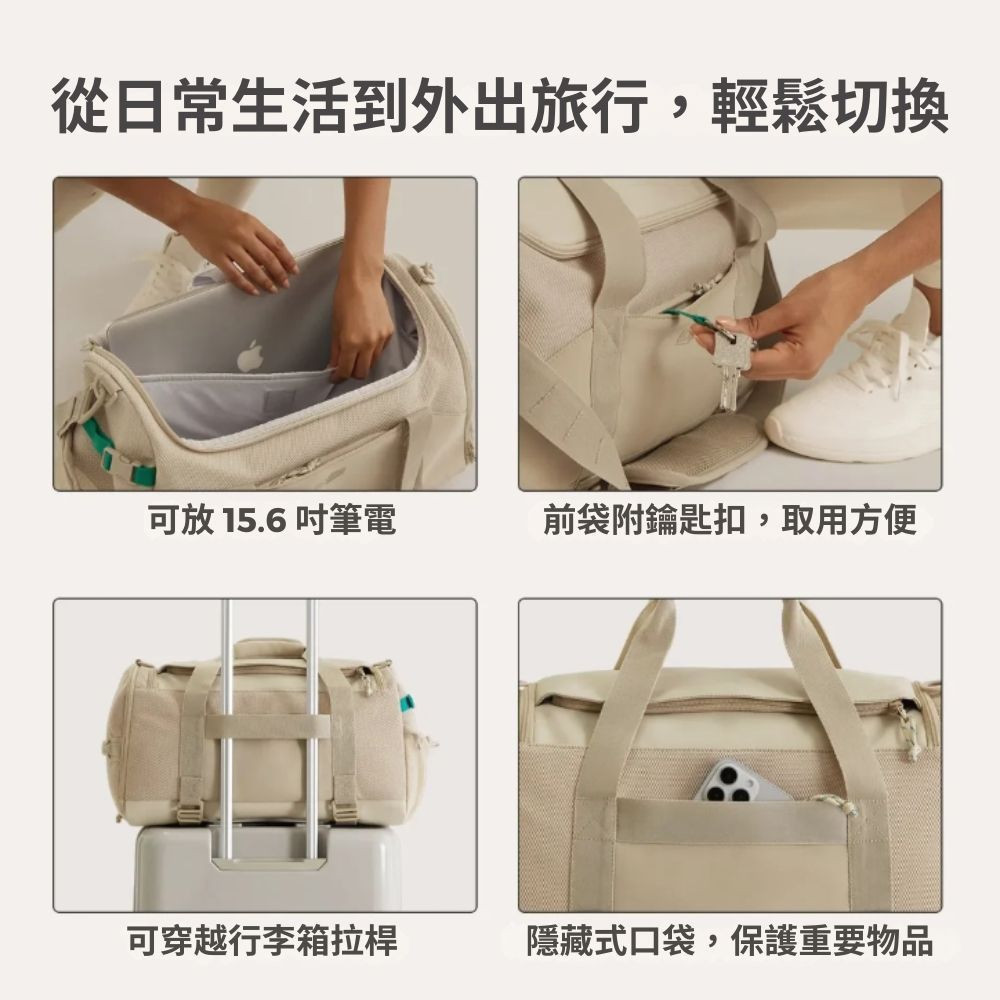 專為提升移動效率設計,具備加厚手把並附魔鬼氈扣,確保手提時穩定不滑落,極致舒適。貼心的側手把設計讓您無論在健身房或飯店,都能輕鬆掛取。搭配實用的行李箱拉桿固定套,讓您在機場移動時更輕鬆。此外,隱藏式後置口袋,可放置手機、錢包等重要物品,讓您的旅程全程從容!