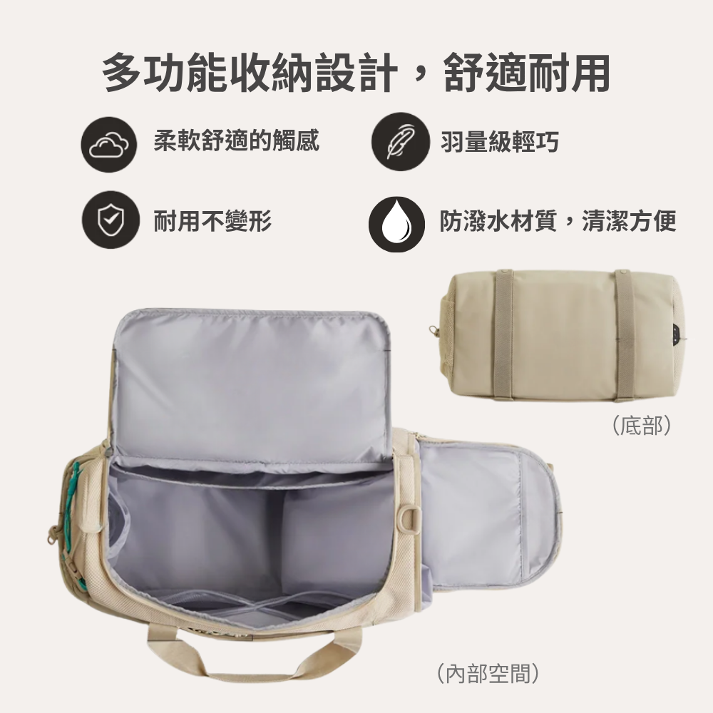 ■ 獨立防水隔層:完美分隔濕毛巾或運動衣物,保持主隔層乾爽整潔,避免交叉污染。