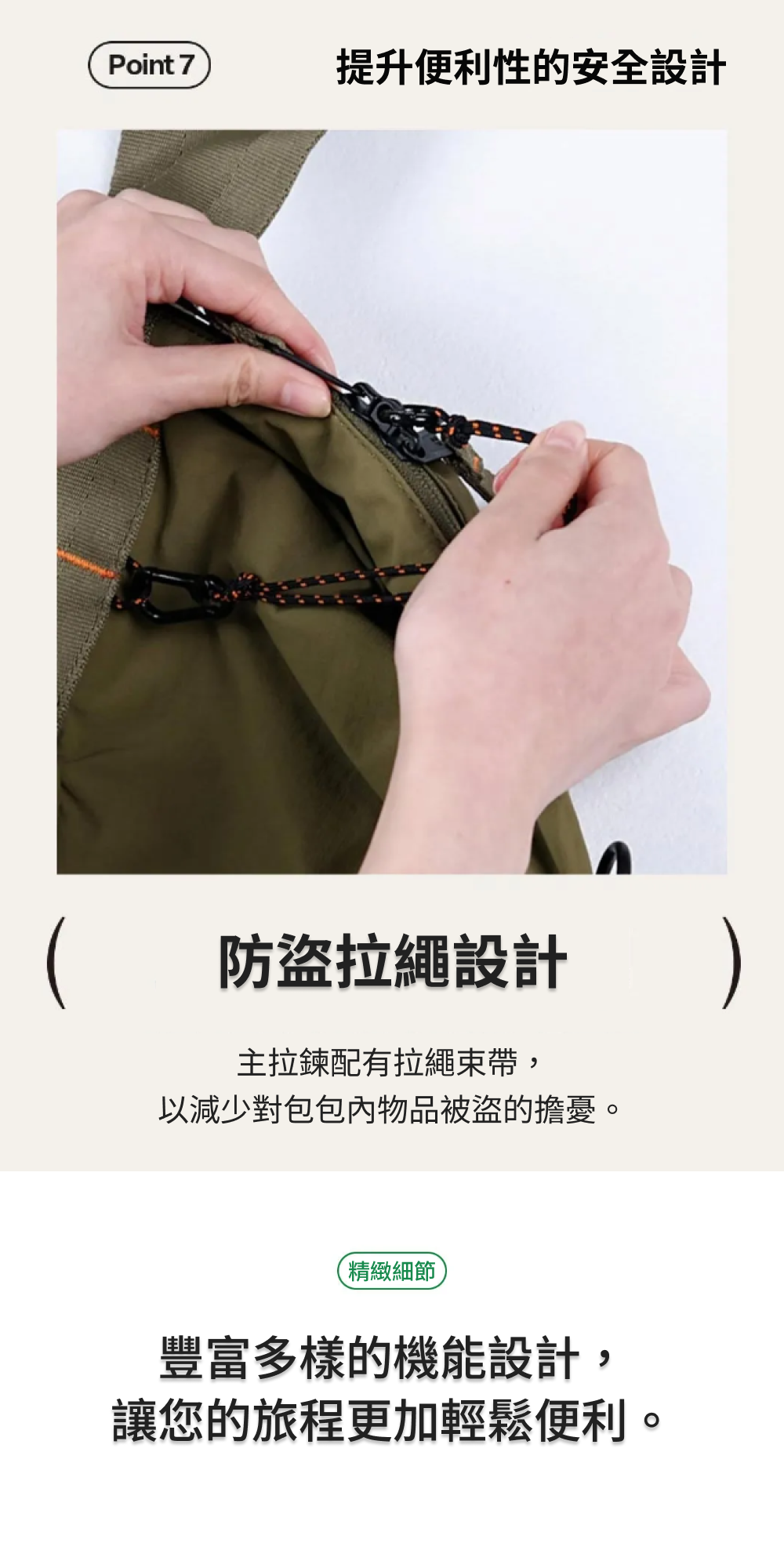■ 防盜功能|主拉鏈有防盜繩設計,可減少旅途中被盜風險。