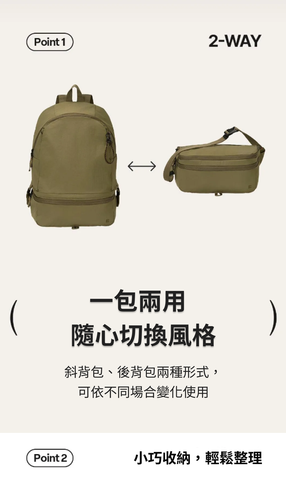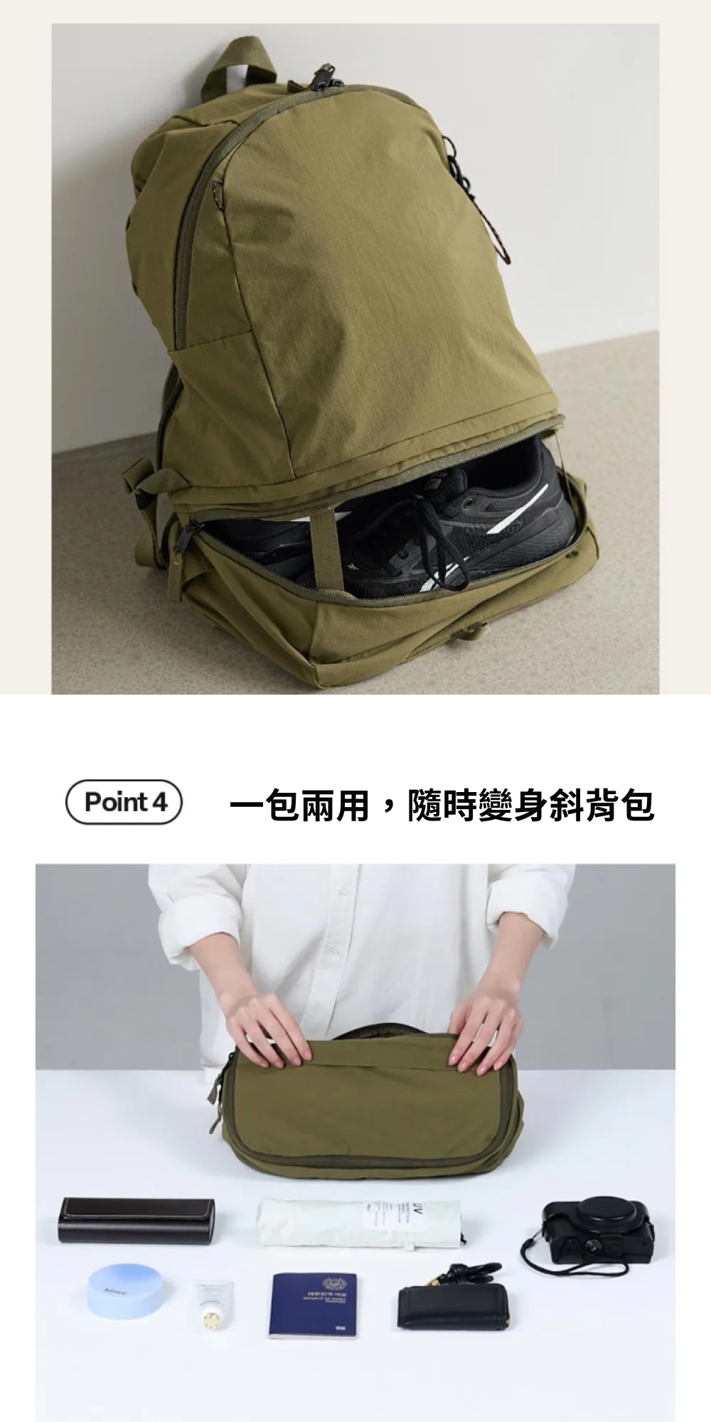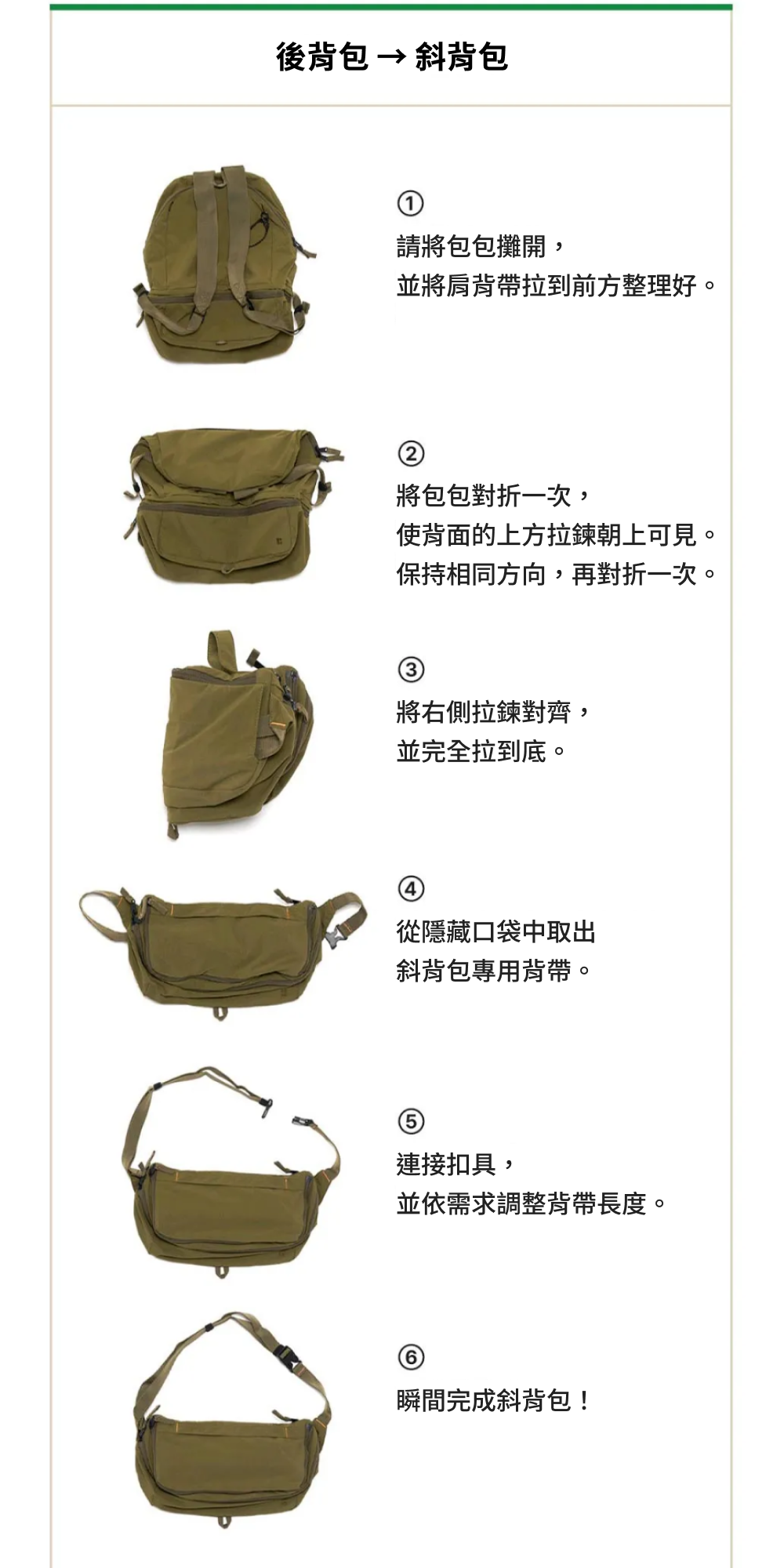 ■ 一包兩用|可以從後背包摺疊成斜背包,旅行或外出只需攜帶一個包。