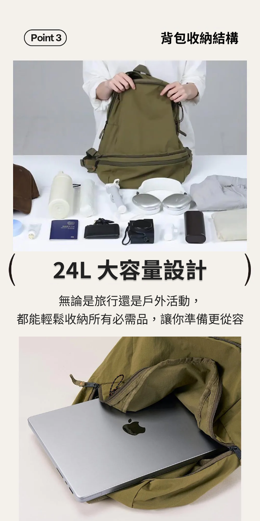■ 超大容量|後背包提供24L大容量,無論旅遊或日常休閒皆適用。