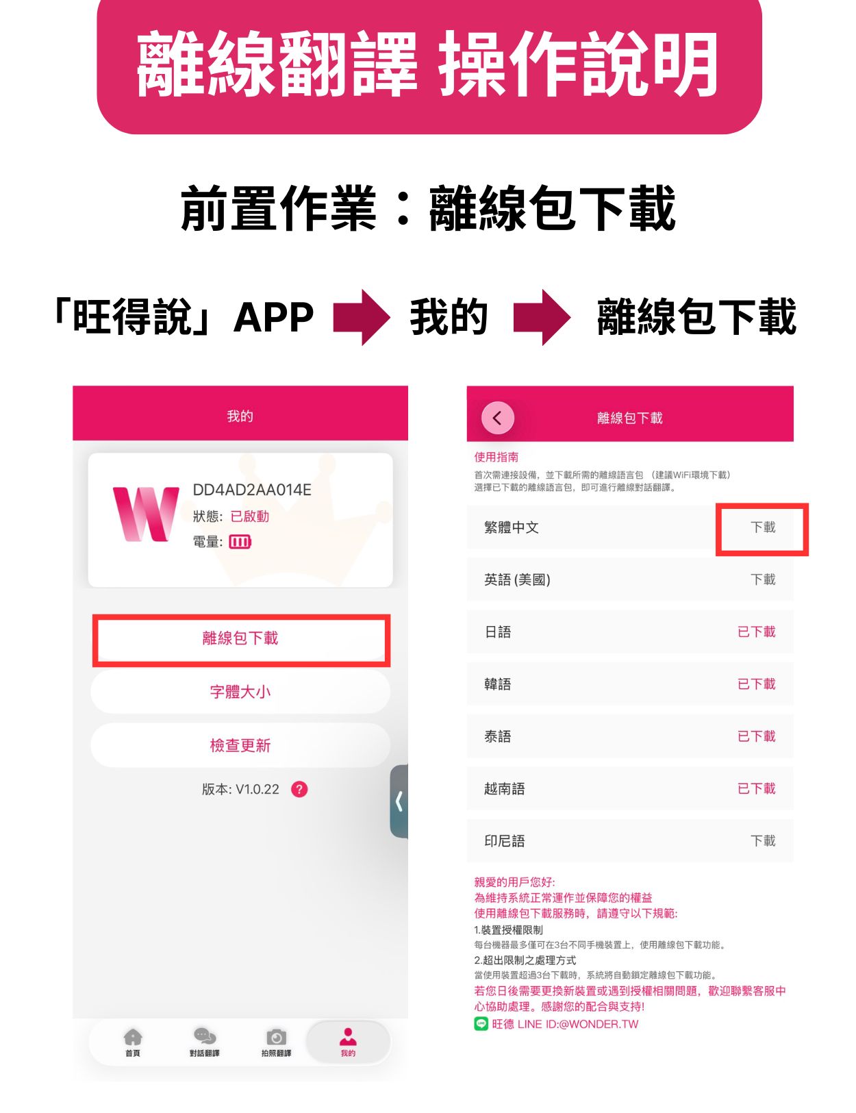 首次使用請至商店下載專屬APP【旺德說】,完成連線後即可使用語音、拍照、影片等翻譯功能。