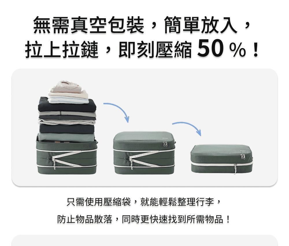 ■ 一拉即壓縮,節省高達 50% 空間。