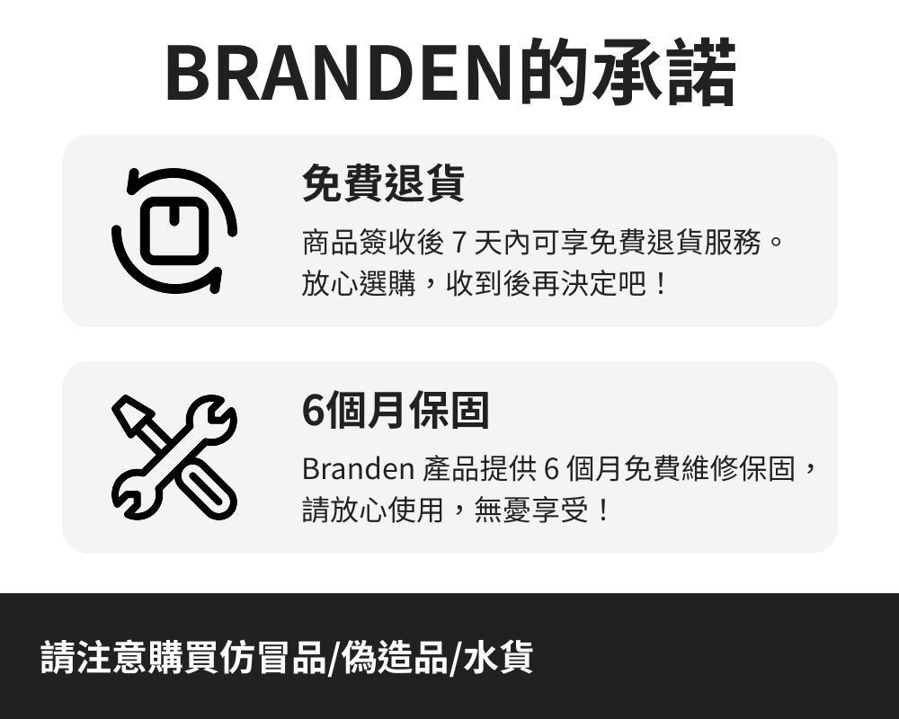 為了與BRANDEN顧客一起攜手度過悠長旅程,我們提供免費售後服務(保固期為購買產品後的6個月內)。