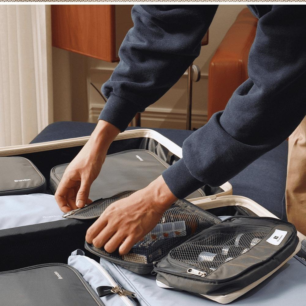依照行李箱型號的不同,若有行李箱難以闔上的情形,請稍微減少收納袋中的物品數量。