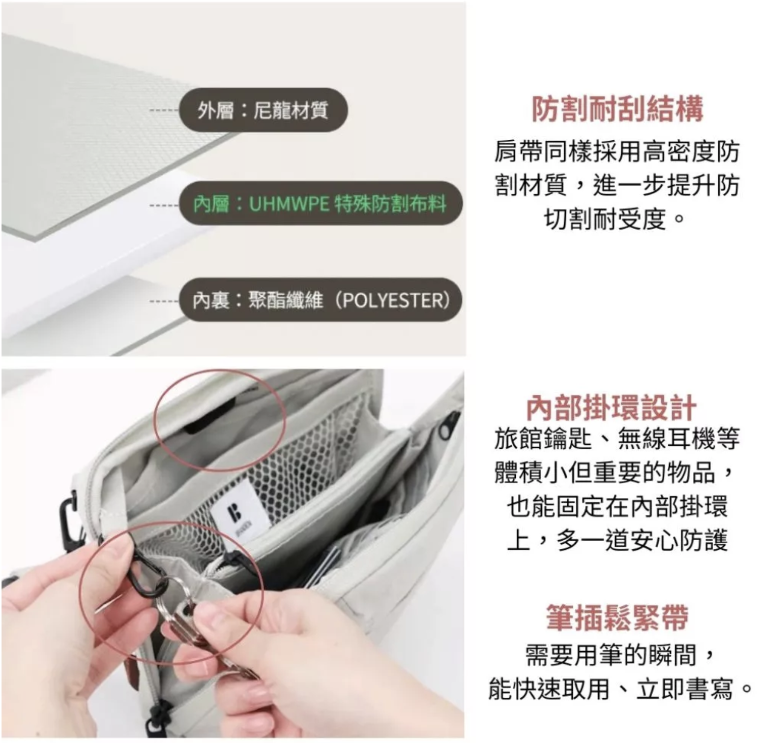 A.防割材質採用高強度纖維製成,一般刀片或尖銳物品不容易造成損傷。但若施加過大力量或使用特殊切割工具,仍有可能受損,因此請避免強烈壓力或反覆刻意切割。