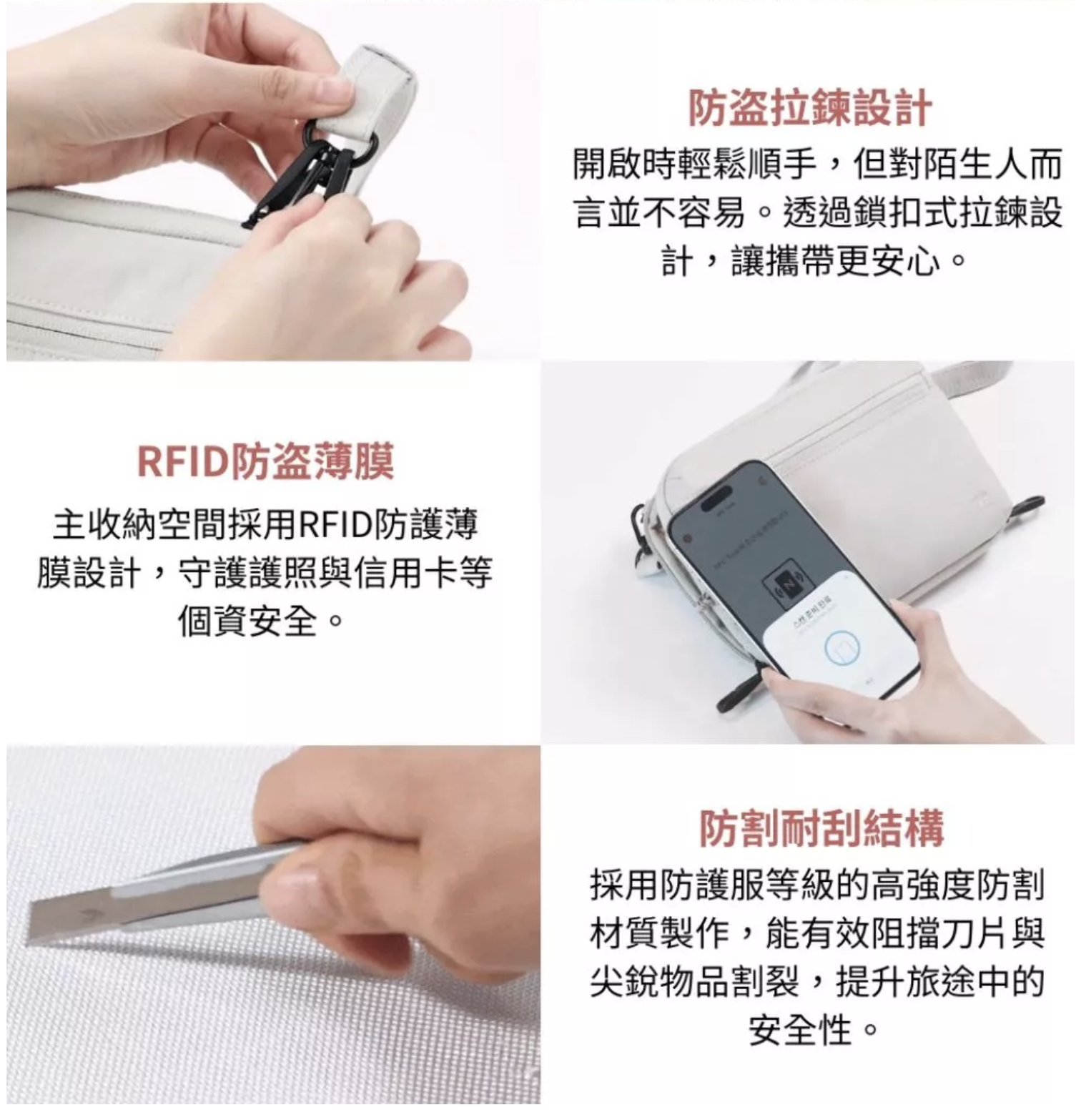 ■ 材 質|外層:尼龍防撕裂布(Ripstop Nylon) / 夾層:UHMWPE防割布料|RFID阻斷層 / 內襯:聚酯纖維