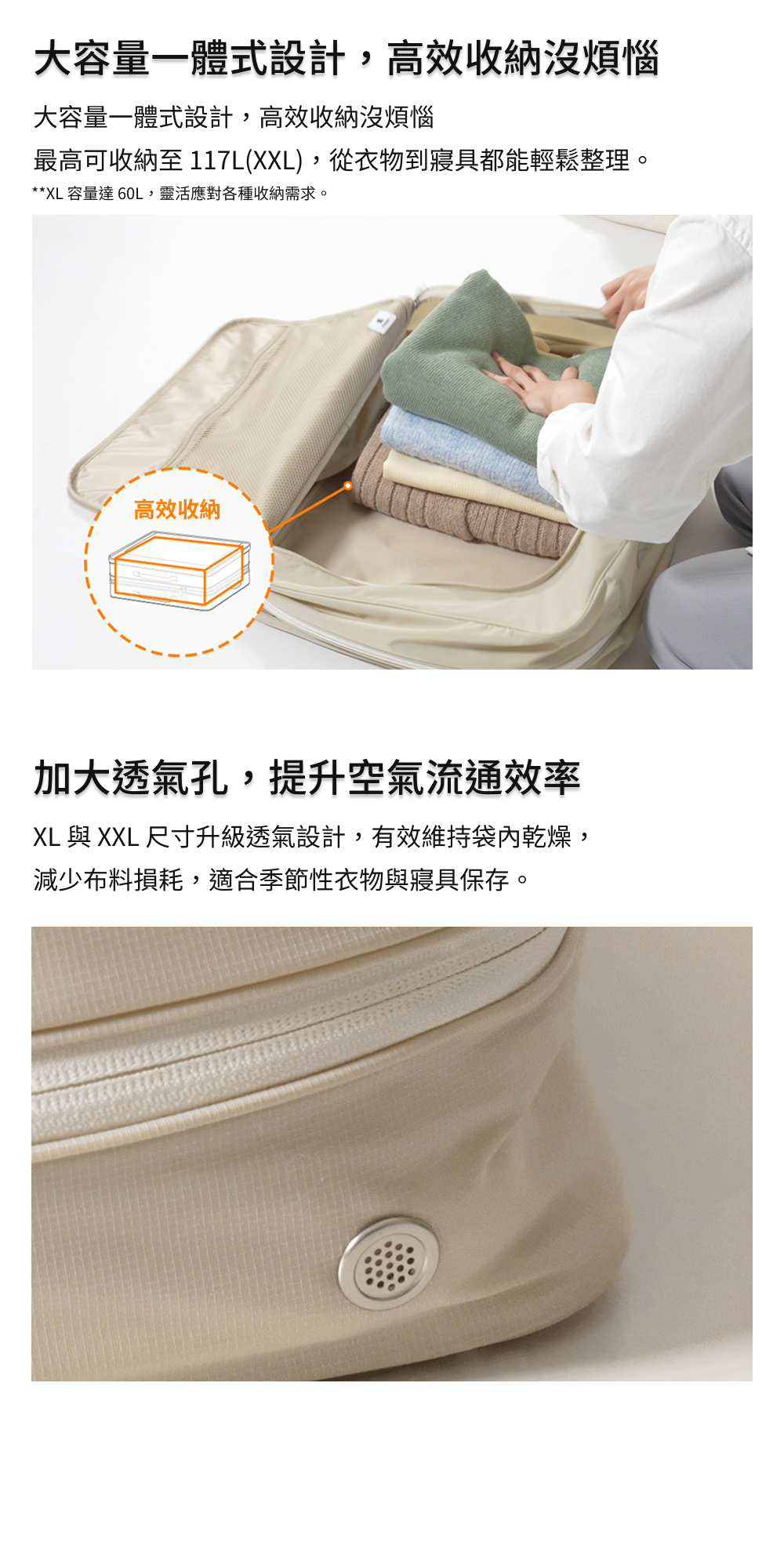 為了減少收納換季棉被與衣物面料損壞,升級了內部氣流順暢的氣孔。